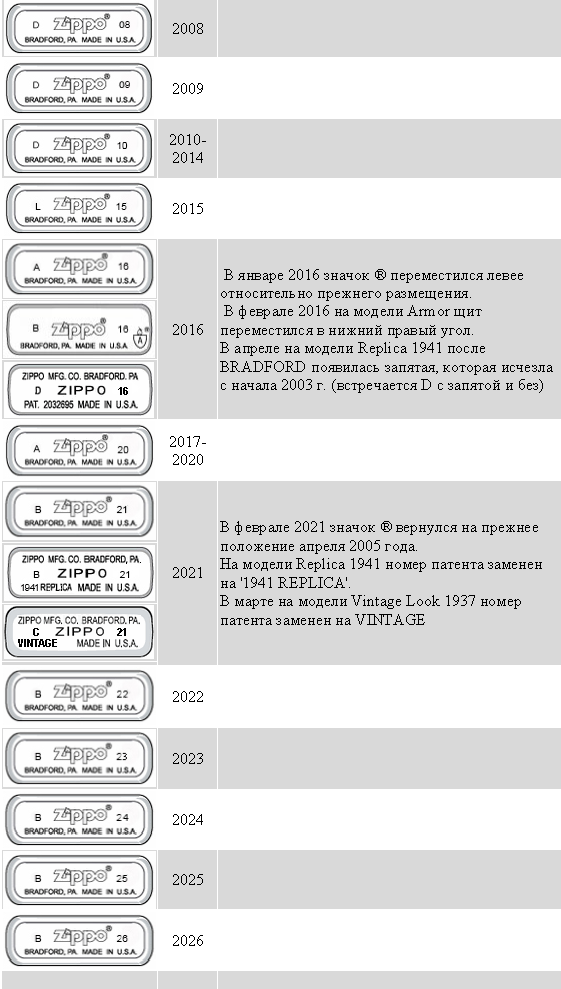 В этой таблице представлены все основные разновидности штампов серийных зажигалок Zippo с 1933 года. Сюда не включены: